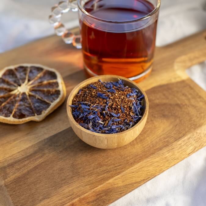 This Rooibos Earl Grey takes the familiar blend to a caffeine-free realm. Rooibos, toasty and slightly sweet, gives the tea a rich, deep flavor to start off. Then you taste the orange/citrus brightness characteristic of bergamot. To round it out, there is a slight floral aspect from blue cornflower blossoms that blends seamlessly with the bergamot.