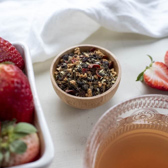 The smooth, light taste of Fresa Guayusa offers an infusion of fruitiness in a heavenly base of guayusa, green rooibos, and jasmine green tea. A cousin to Yerba Mate, Guayusa has shown to reduce physical and mental stress. It also features nearly double the antioxidants of traditional tea and provides a clean source of caffeine energy, bringing a gentler caffeine effect than a cup of coffee or energy drink. Paired with rosehips, hibiscus, and the tart flavor of schisandra berries, this specialty blend brings together the essence of earthiness and floral fragrance in one perfect cup.