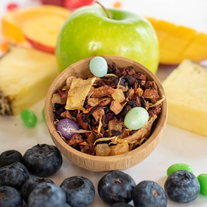 Bursting with juicy flavor, this caffeine-free herbal blend is perfect for celebrating the warm weather right around the corner! We start with an impeccable combination of your favorite fruity flavors, including mango, strawberry, and blackberry, and then balance it out with the floral additions of hibiscus and rosehip. Top it all off with some brightly colored jelly beans and you have a sweet treat that the whole family will enjoy!