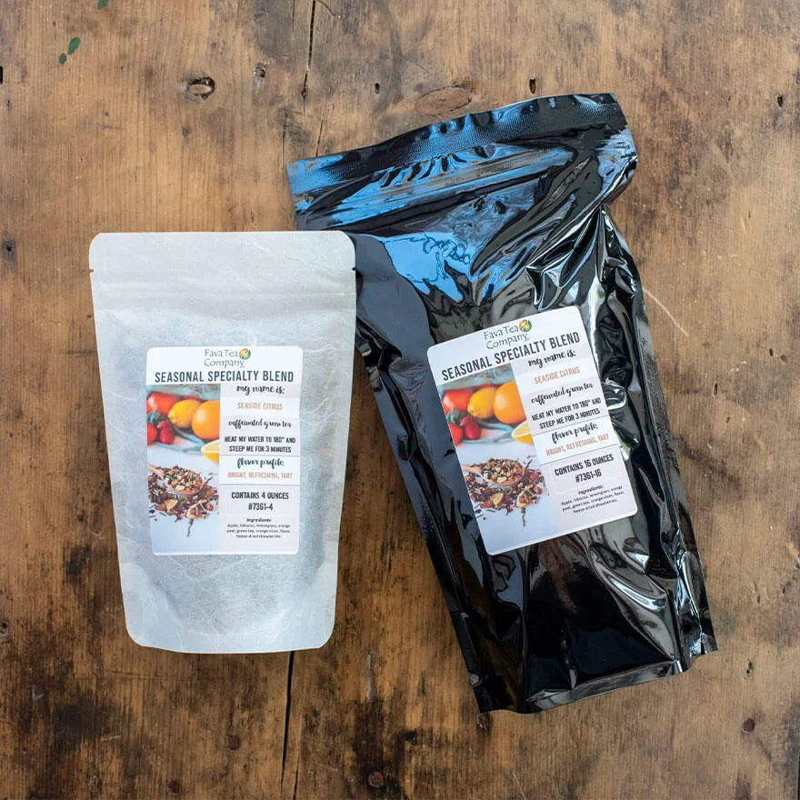 Seasonal Specialty Loose Leaf Green Tea available in TEAser, 4-ounce, and 1-pound packages.